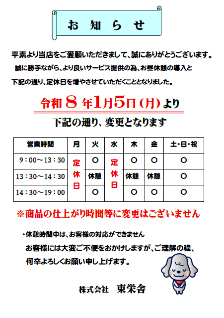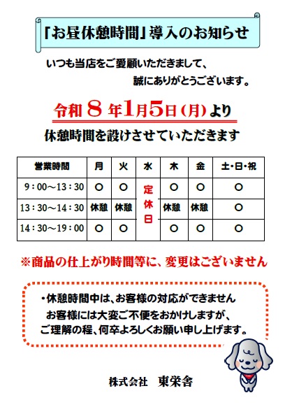 R8’1月5日(月)より、平日(土・日・祝日を除く)の 13:30~14:30を「昼休憩」